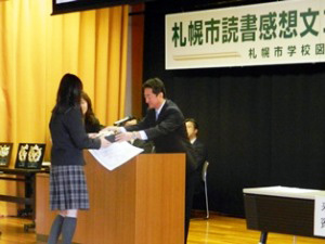 表彰式において、私からは「皆さんが、もっと読書を好きになり、読書による素晴らしい感動を体験するとともに、新たな知識をどんどん吸収して大きく飛躍する力を身につけていかれることを願っております。」とあいさつし、特別賞である札幌市議会議長賞受賞者に表彰状と盾を贈呈しました。