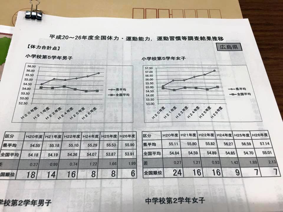 全国体力、運動能力調査で福井県は毎年1位であり、広島県においては中位にありましたが、年々順位が上がり現在は1桁にあります。